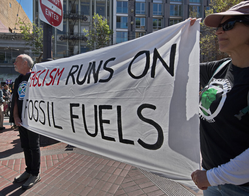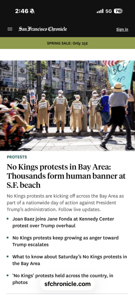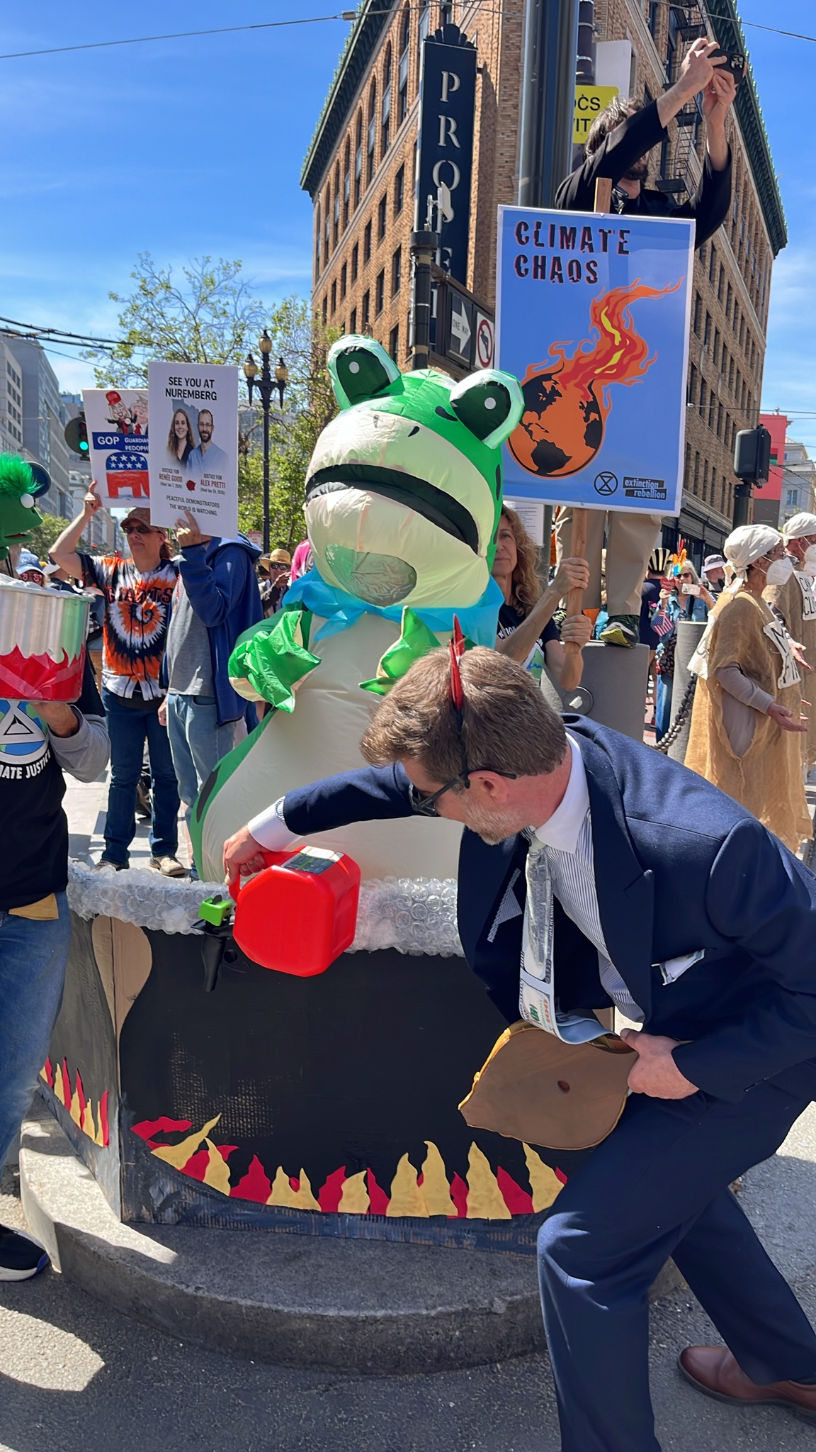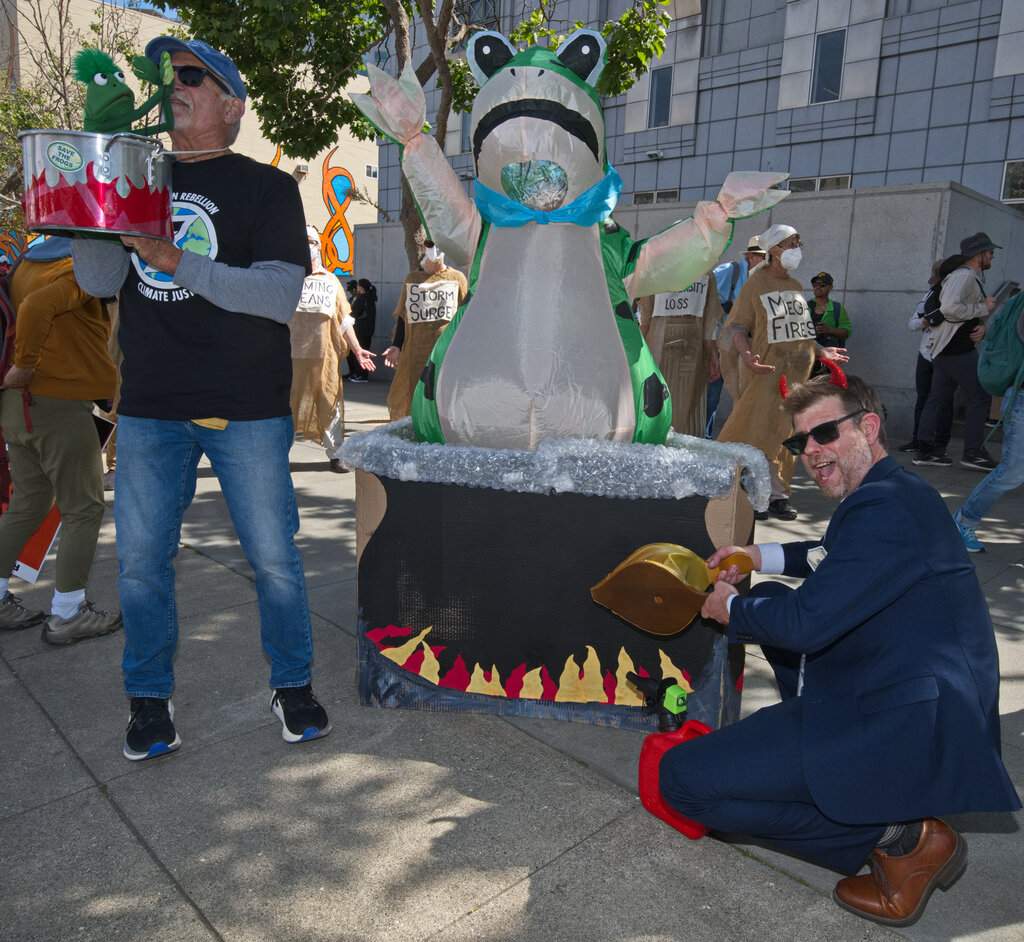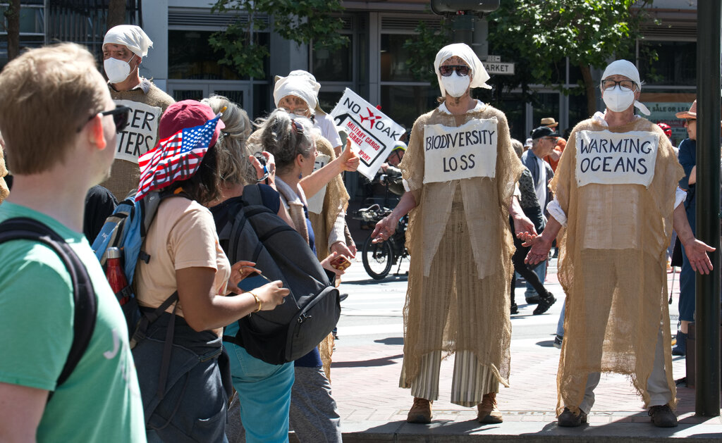 The XRSFBay street theater crew was out in force for No Kings 3! As thousands of marchers walked past, our goal was to bring the climate crisis into the “Trump Must Go” conversation, with the slogan “Fascism Runs on Fossil Fuels.” Great reactions from the crowd and our Lamentors were featured in the San Francisco Chronicle and Guardian!