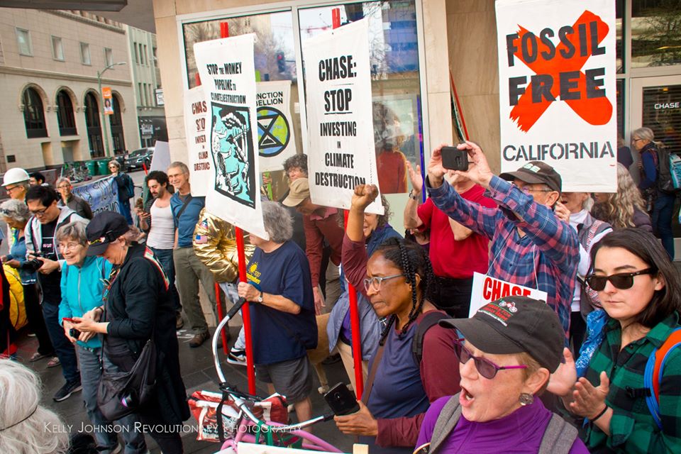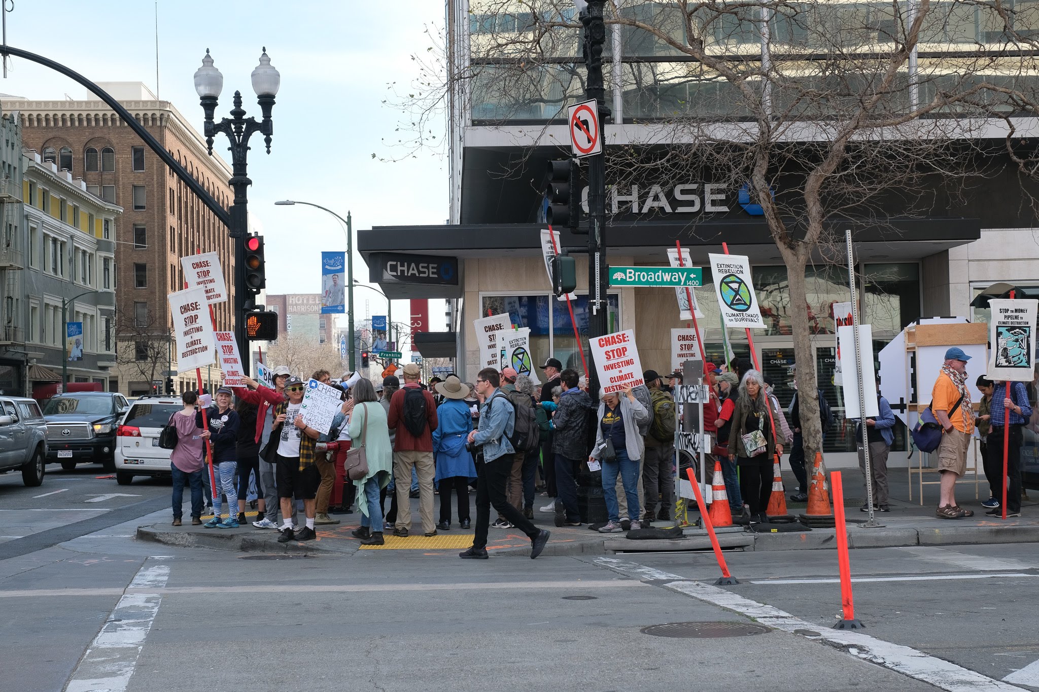 Extinction Rebellion San Francisco Bay Area continued our effort to Stop the Money Pipeline @Chase with creative disruption at the Chase Bank, 1330 Broadway, Oakland on Friday, February 28. Over 130 people showed up to demand that JPMorgan Chase – the largest funder of fossil fuel projects – divest immediately to protect the planet.