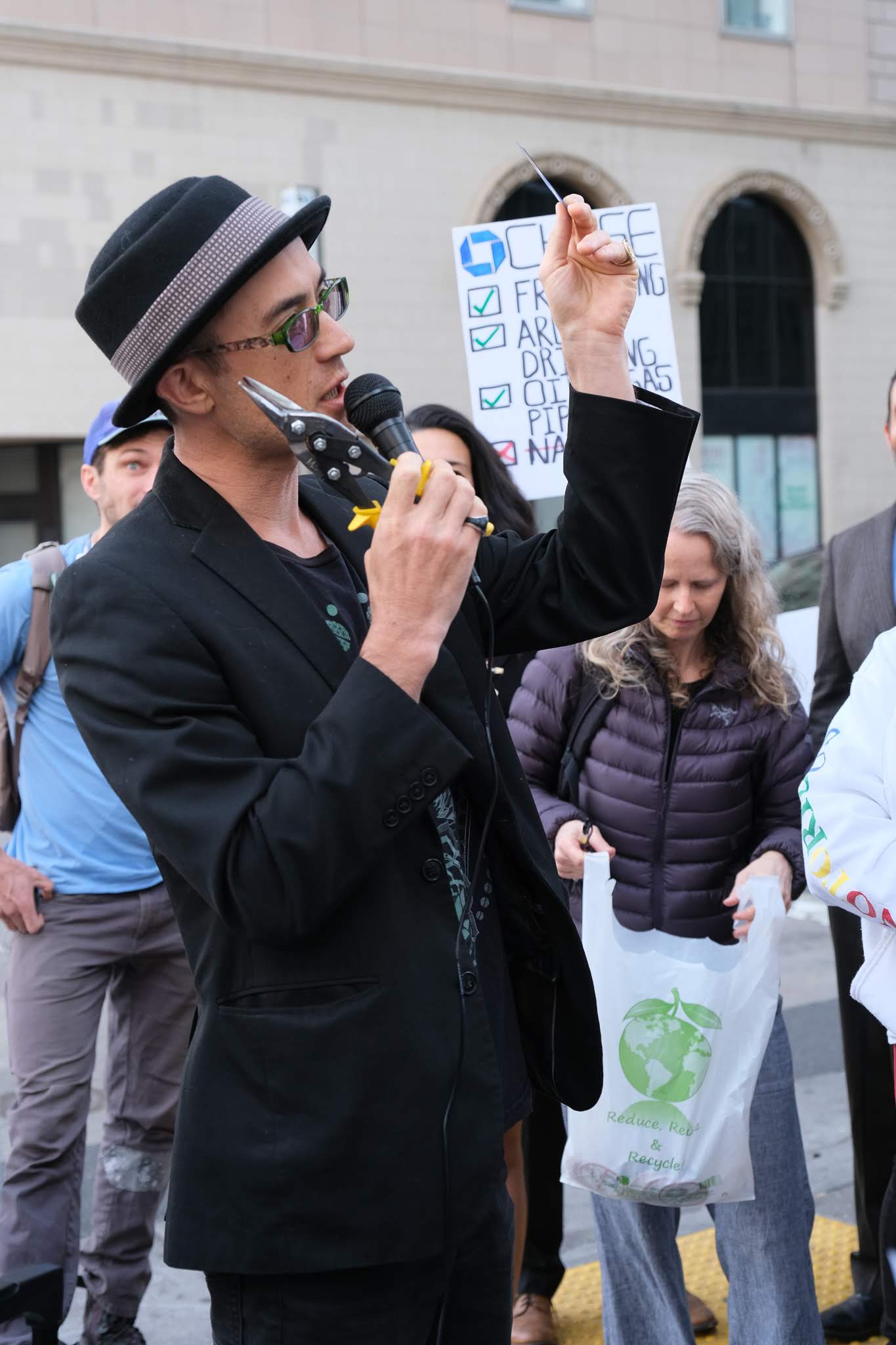 We used a combination of theater, ritual and direct action to engage with bank officials and the general public. People who were current clients of Chase Bank participated in the #CutTheChaseChallenge, as they publicly cut up their Chase credit or bank cards to protest the bank’s ongoing support of climate destruction. Another group, including a contingent of young people from 10 - 18 years old, signed a No Chase Pledge to commit to not banking with Chase now or in the future - until the company divests from fossil fuels.