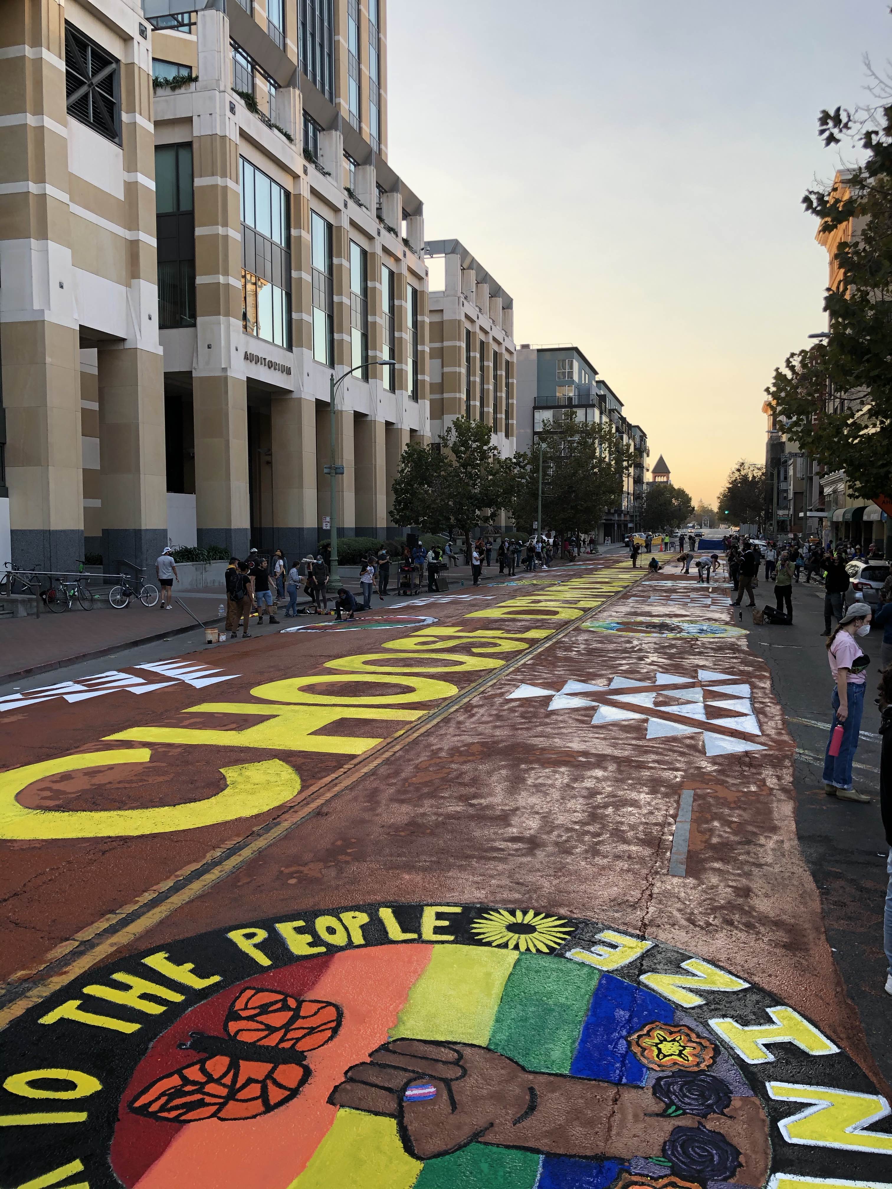 On Thursday, October 29th hundreds of artists got together to paint 14th Street in downtown Oakland with the message “CHOOSE DEMOCRACY STOP A COUP”.