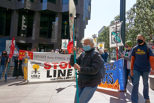Heeding the call from Indigenous activists on the frontlines in Minnesota, on Friday March 19th activists from all around the Bay Area converged in San Francisco’s “Wall Street West” district to let four dirty banks know it’s time to end pipeline funding.