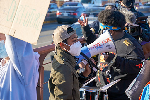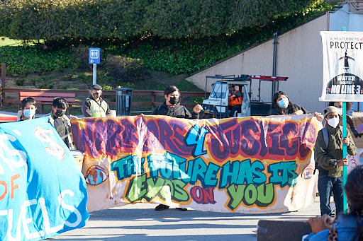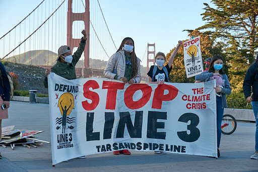 Yesterday’s action featured speeches from youth organizers, spirited chants and marching drums, and a banner drop from the bridge urging CalSTRS to stop financing projects that harm Indigenous and other frontline communities the most, and are robbing students of a stable climate in their futures. The movement to stop the Line 3 pipeline project added urgency to this call, since we are in a critical window of time to halt the construction on this incredibly damaging tar sands pipeline.