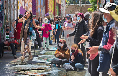 We gathered on June 6th, 2021 to celebrate the unveiling of Extinction Rebellion San Francisco Bay Area’s new mural, “The World is on Fire,” with music, art, dancing, poster printing, and inspiring speeches. The mural is larger than life and has to be seen in person to fully appreciate the love and detail that our Art Working Group painters put into this, over many months during COVID lockdown in 2020.
