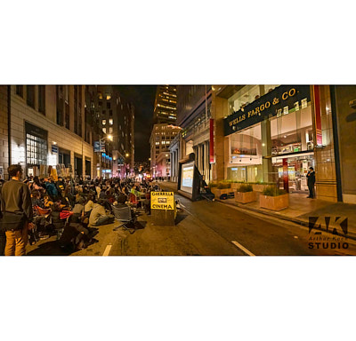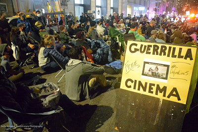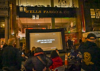 Last Friday, around 200 activists converged in the heart of Wall Street West in downtown San Francisco to train in civil disobedience, blockade the street in front of the Wells Fargo Bank world headquarters, and throw a guerrilla film night on an inflatable 20 foot screen — complete with homemade popcorn and a pop-up art show.