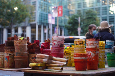 The murals were created with non-toxic tempera that incorporated ash from the California wildfires and clay powder from from Ione, CA — Miwok Territory in the Sierra foothills. Several of the day’s speakers were survivors of those fires, bringing the tragedy of climate change to the door of BlackRock, the #1 funder of fossil fuels and deforestation. As the mural was being created, eight activists, including several from Extinction Rebellion, chained themselves to the front doors of BlackRock for five hours in a symbolic effort to demand an end to BlackRock’s damaging “business as usual.”