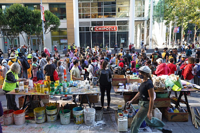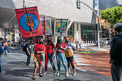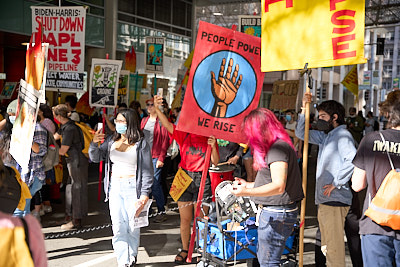 On Friday, October 29, two days before the start of the United Nations COP26 climate conference in Glasgow, the Bay Area climate justice community joined together as part of a Global Day of Action to demand that financial institutions and governments immediately stop funding the fossil fuel projects that are feeding the climate emergency. Led by indigenous and youth activists, several streets in downtown San Francisco were blocked as groups created an enormous street mural showing messages of warning and hope. Youth Vs. Apocalypse led a march to the Federal Reserve to demand that banks and President Biden #DefundClimateChaos.