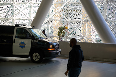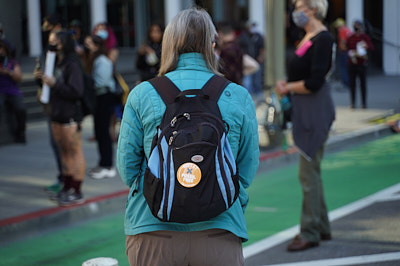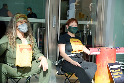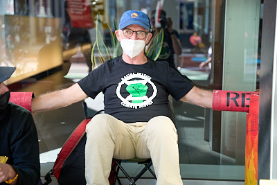 In addition to the action on the ground, two courageous young people scaled the wall of the Transbay terminal to unfurl a banner saying: “Investments set the world on fire from CA to Amazon #DefundClimateChaos.” The two were arrested after they returned to the ground, and were later cited and released. If you’d like to learn more, check out this inspiring recap with powerful statements from the climbers and many of the other participants.